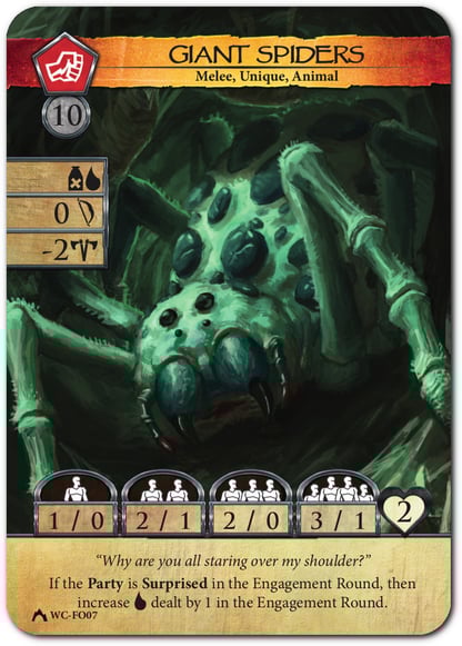 3 - Now we must draw a foe from the adventure deck. You draw the Giant Spiders card. The surprise rating is 10, you fail to surprise the creatures and you must fight them. They cause extra damage to you but through a mixture of talents and bravery you defeat the lurking danger.
